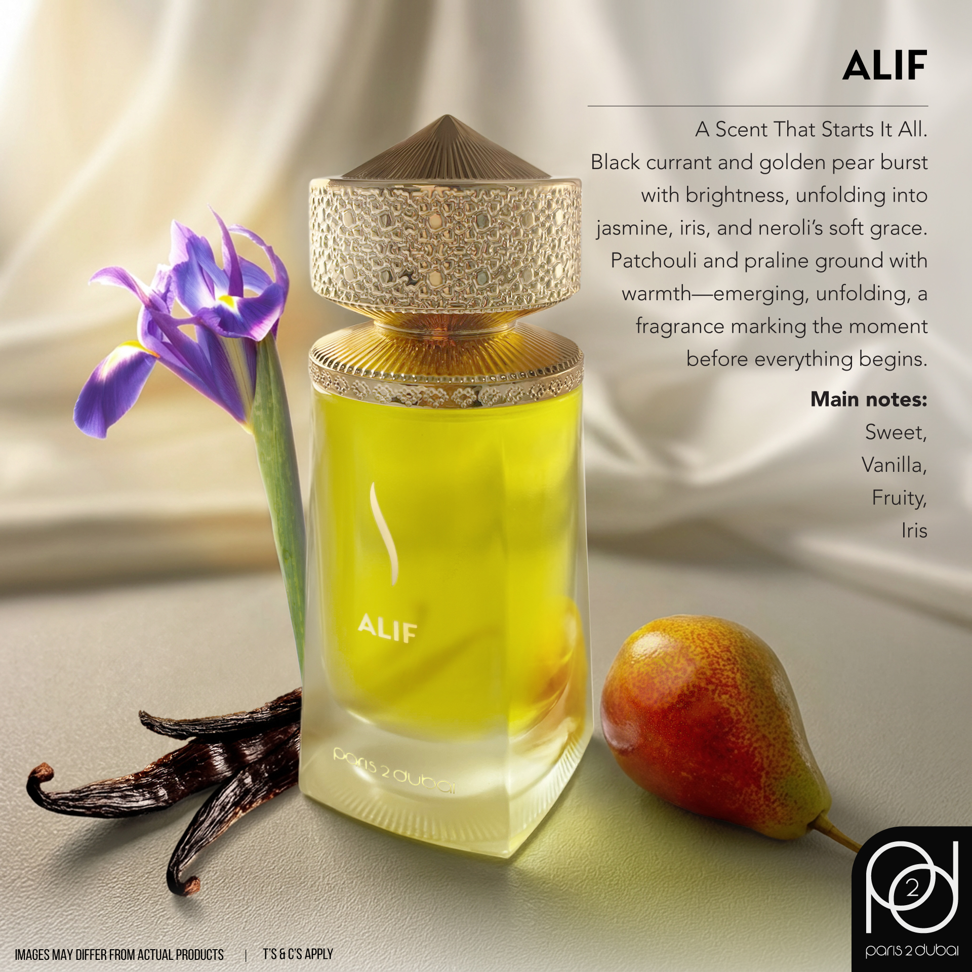 Like the hush before a first word — Alif begins with black currant and golden pear, bright and succulent, like fruit bursting in early morning light.