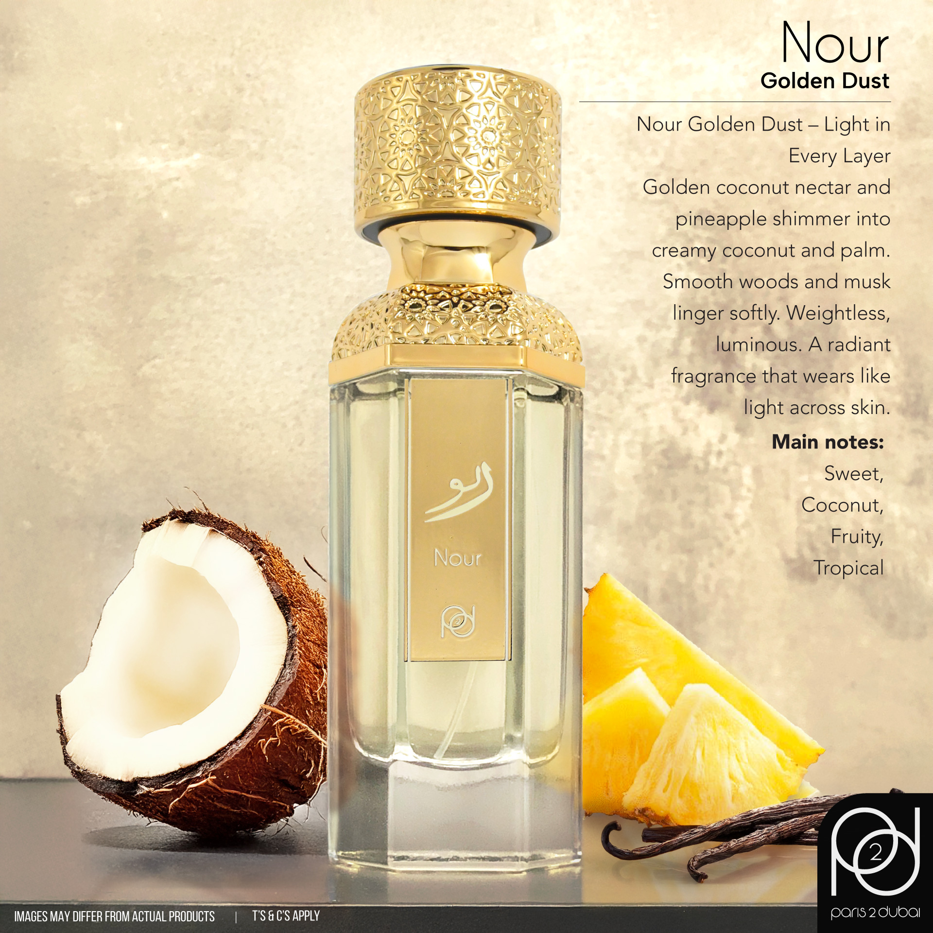 Soft as sunlight filtered through palms — Nour Gold opens with golden drops of coconut nectar and sun-ripened pineapple, luminous and inviting.