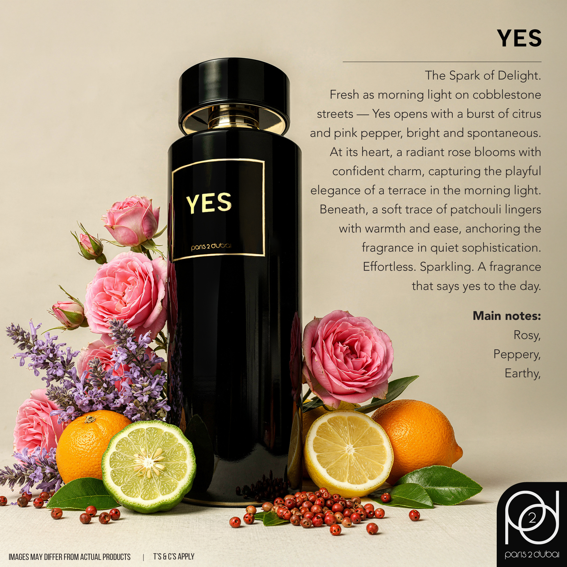 Fresh as morning light on cobblestone streets — Yes opens with a burst of citrus and pink pepper, bright and spontaneous.